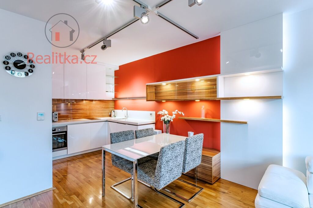 •	Kuchyň: Nová kuchyňská linka v dekoru bílého lesku, vybavená vestavnou lednicí, myčkou, troubou, dvouplotýnkovou varnou deskou, odsavačem par a mikrovlnnou troubou.
