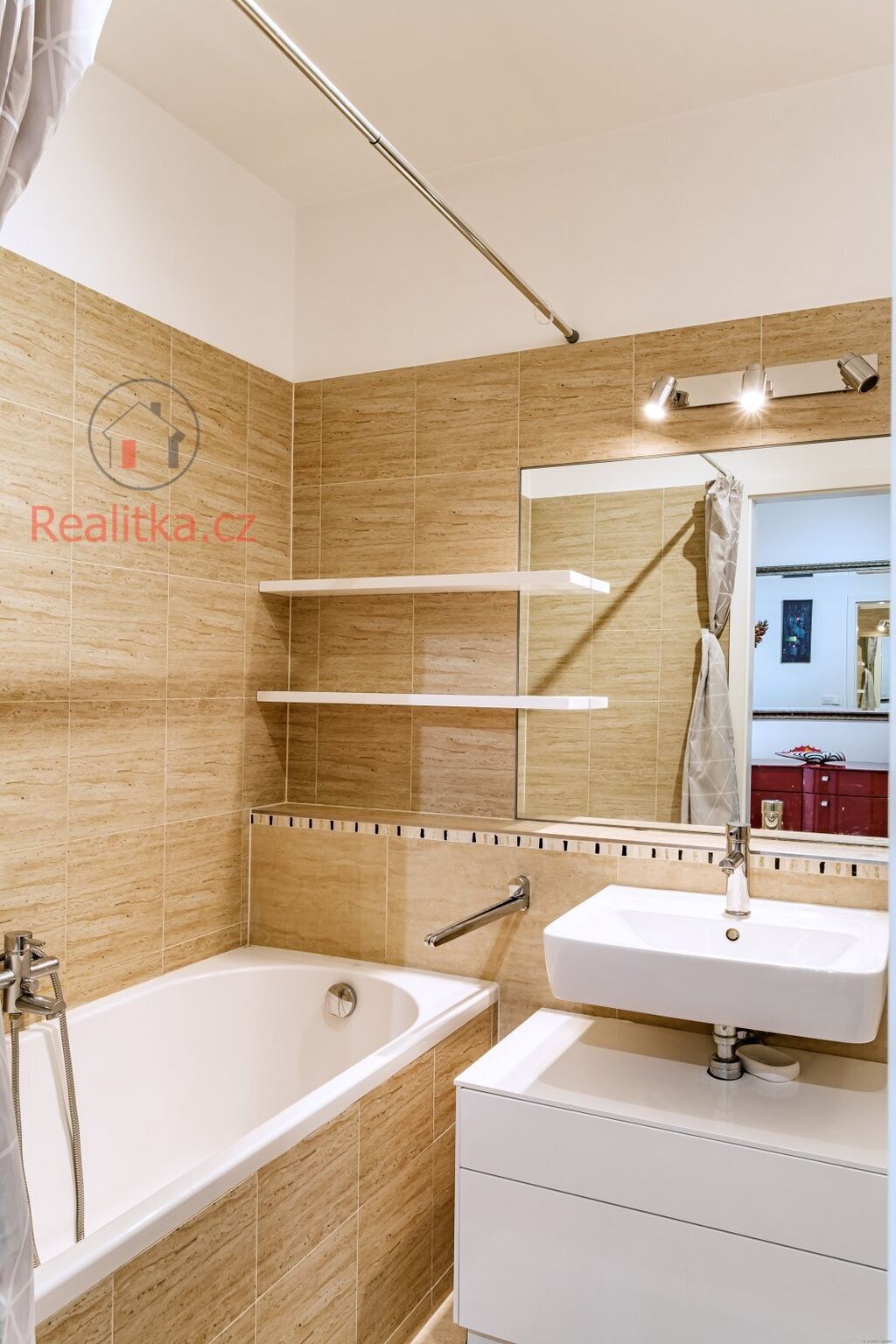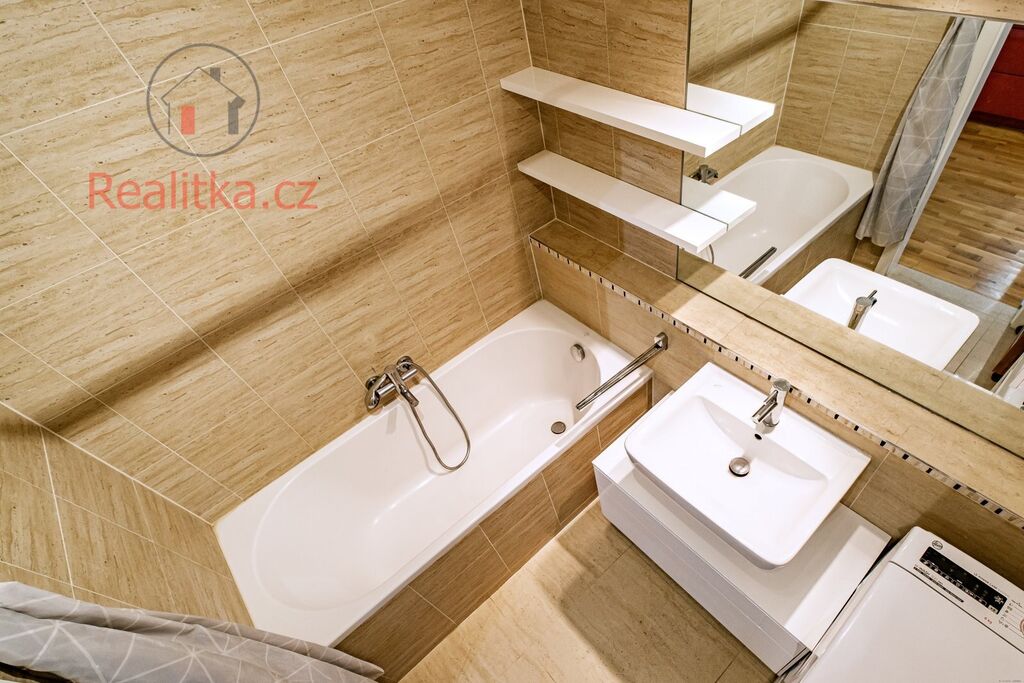 •	Koupelna: Vana, podlahové vytápění a žebřík na sušení, keramický obklad a dlažba