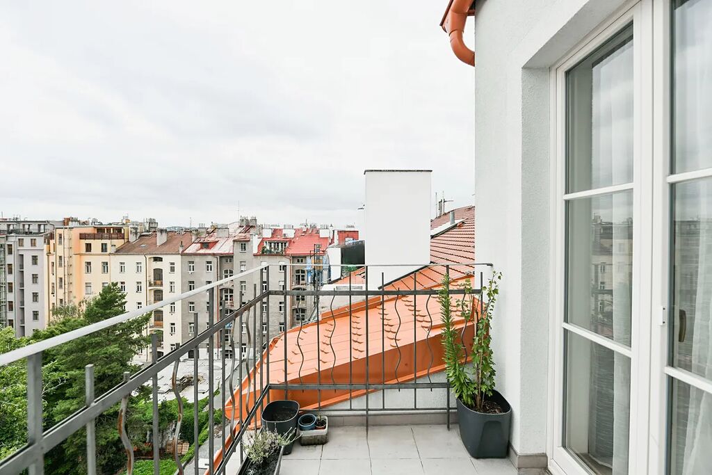 V ulici Korunovační - v krásném renovovaném secesním domě s výtahem, nabízím k pronájmu byt 3+kk s terasou a výhledem na panoramu Hradčan. Byt se nachází v 6NP, má podlahovou plochu 91  m2 a sestává se z obývacího pokoje s plně vybaveným kuchyňským koutem, dvou ložnic, předsíně, koupelny se sprchovým  koutem, toalety, terasy a sklepa.