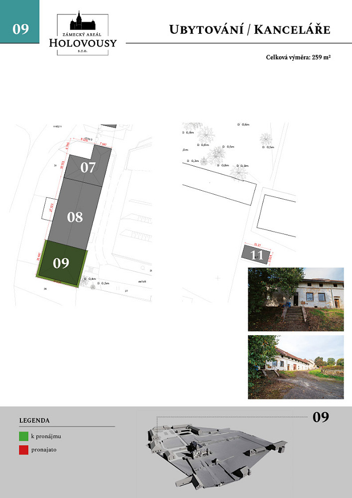 V zámeckém areálu nabízíme 2kk s výhledem do zeleně a na zámek. Celková výměra obytné plochy je 36 m² s možností využití venkovní plochy před bytem. V hlavní budově je sklep i půda. Párkování přímo v hlídaném zámeckém areálu, domácí zvířata povolena!