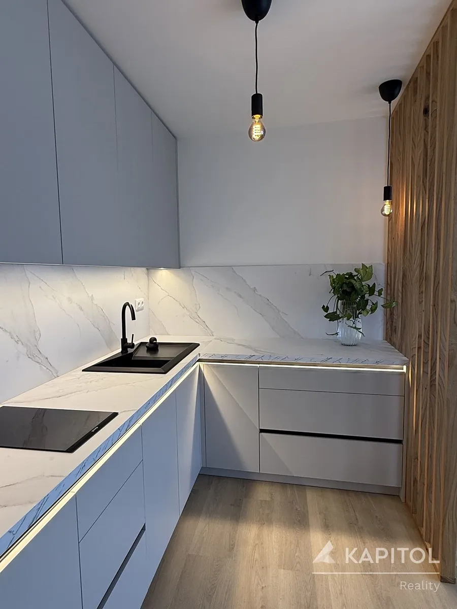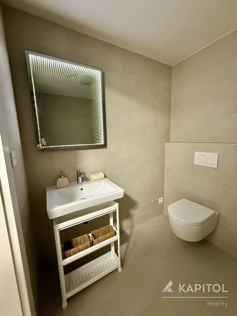Byt je laděn v elegantním a čistém designu, vytvářející útulnou atmosféru, která působí harmonicky a nadčasově. Součástí bytu je moderní systém rekuperace, který zajišťuje stálý přísun čerstvého vzduchu a zároveň šetří energie. Byt řízen systémem inteligentní domácnosti zn. Loxone.
