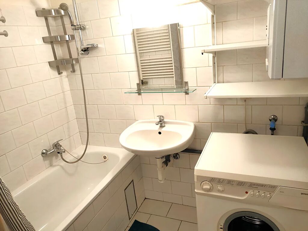 Koupelna je samostatná s vanou, umyvadlem, pračkou, topným žebříkem a WC je také samostatné.