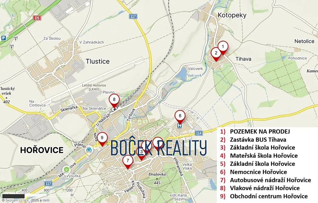 V zastoupení majitele nemovitosti Vám nabízíme jedinečnou příležitost ke koupi stavebního pozemku o celkové výměře 1.354 m² pro stavbu Vašeho vysněného domu v obci Tíhava u Hořovic. Jedná se o mírně svažitý oplocený pozemek se zavedenými IS - elektřina, veřejný vodovod. Tento pozemek Vám poskytne dostatek prostoru pro Vaše nové bydlení. Na pozemku je v současné době postavena dřevěná chatka s přístřeškem vhodná pro uložení zahradního a stavebního nářadí a materiálu. Na pozemek již bylo vydáno územní rozhodnutí a stavební povolení pro stavbu rodinného domu typu BUNGALOV o dispozici 4+kk s užitnou plochou 104 m², domovní ČOV a retenční nádrže. Kompletní stavební dokumentace je součástí prodeje. Příjezd na pozemek zajištěn z obecní komunikace. Veškerá občanská vybavenost se nachází v blízkém městě Hořovice vzdáleného 2 km. Pro více informací, případně pro domluvení prohlídky nás neváhejte kontaktovat.