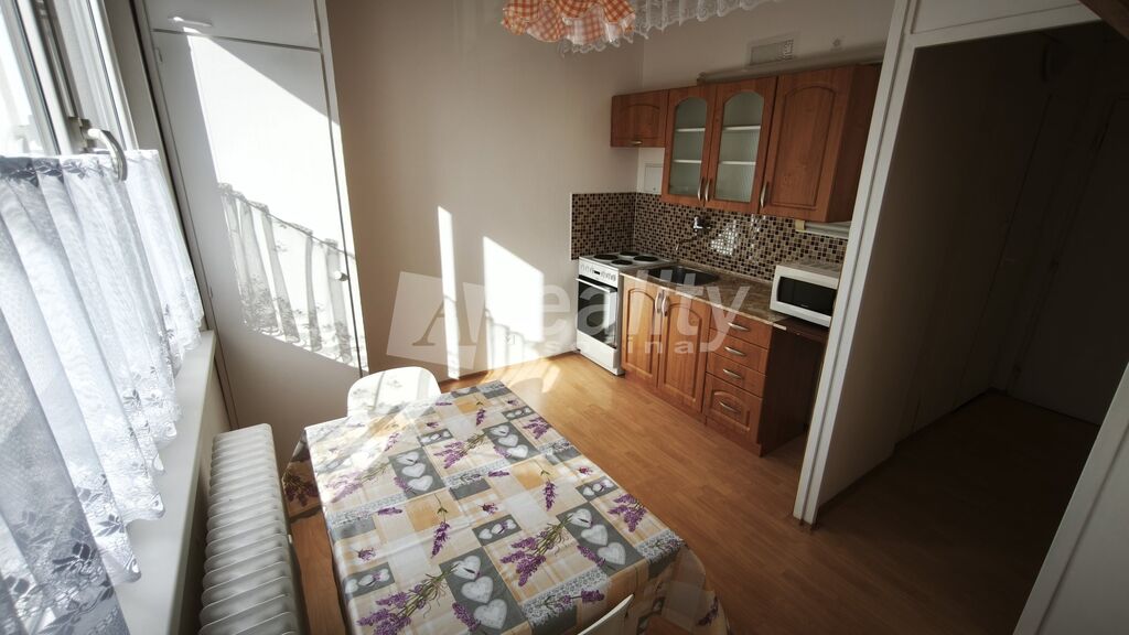 Byt je nabízen k pronájmu částečně vybavený: kuchyňská linka s novým elektrickým sporákem a troubou, mikrovlnná trouba, jídelní stůl a dvě židle, dvě závěsné skříňky v kuchyni, police, šatní skříň, prosklená komoda, stolek pod TV, konferenční stolek.