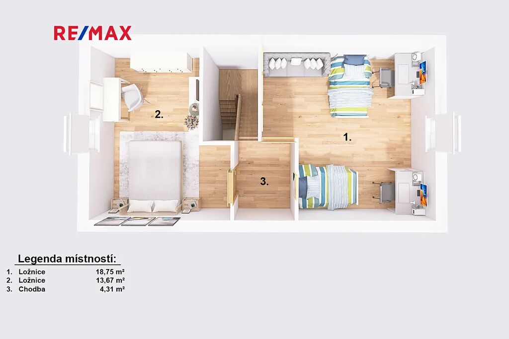 V přízemí na Vás čeká útulná kuchyně s krbovými kamny s výměníkem, které v zimě vykouzlí domovskou atmosféru i teplo poctivého ohně. Dále tu najdete koupelnu, obývací pokoj a praktický prostor pod schody ideální pro uložení věcí, které chcete mít po ruce. Z obývacího pokoje vede cesta do patra se dvěma samostatnými ložnicemi – klidnými, příjemnými a s vůní dřeva, která ke stylu chaty jednoduše patří.