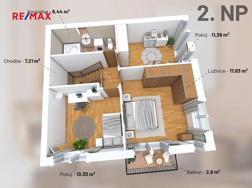 V patře mezonetového bytu naleznete tři samostatné pokoje a koupelnu s vanou a WC (viz půdorys ve fotogalerii).