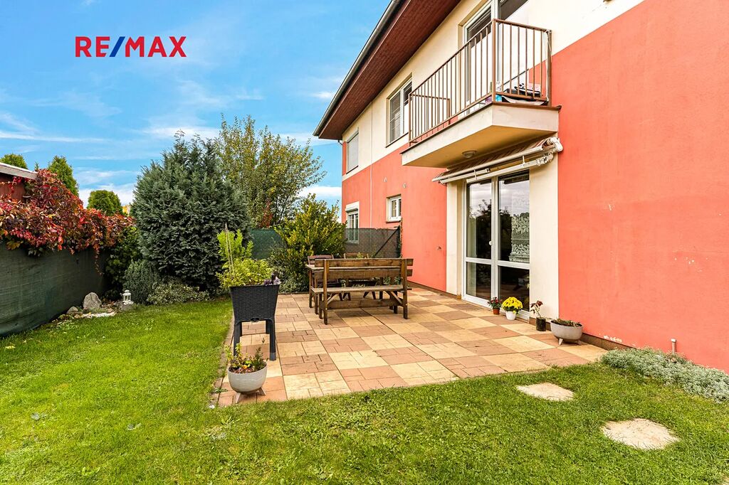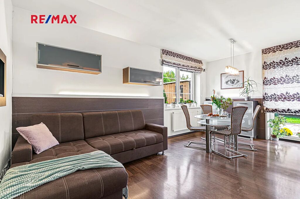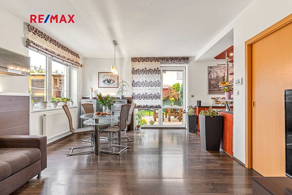 Z obývacího pokoje je přímý vstup do menší zahrady, která vybízí k příjemnému posezení či grilování s rodinou a přáteli.