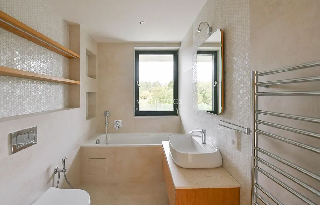 Byt je umístěn v posledním patře domu s velkou terasou, která skýtá soukromí a s další terasou u ložnice s výhledem do lesoparku. Obývací pokoj je propojen s moderní kuchyňskou linkou vybavenou kvalitními spotřebiči (el. keram. deska, lednice s mrazákem, myčka, digestoř, el. trouba, mikrovlnná trouba).