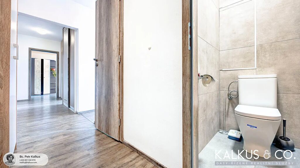 Byt disponuje centrální prostornou chodbou (cca 13 m²), ze které je samostatný vstup do všech neprůchozích místností – ideální řešení i pro větší rodinu.