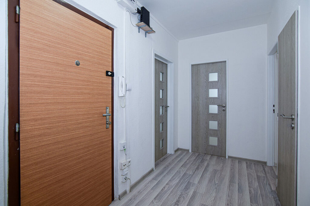 Okna jsou plastová s žaluziemi. Na podlaze je položené linoleum světle šedé barvy. U vstupních dveří je k dispozici šatní skříň.