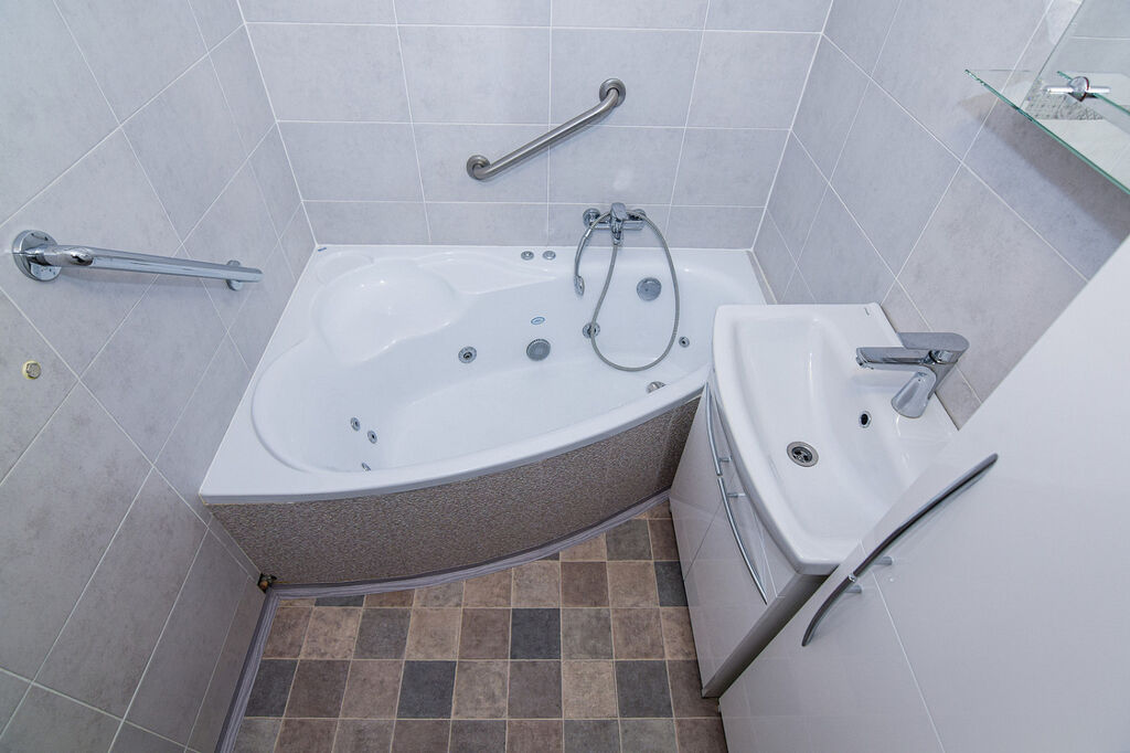 Koupelna disponuje hydromasážní rohovou vanou, umyvadlem a skříňkami.