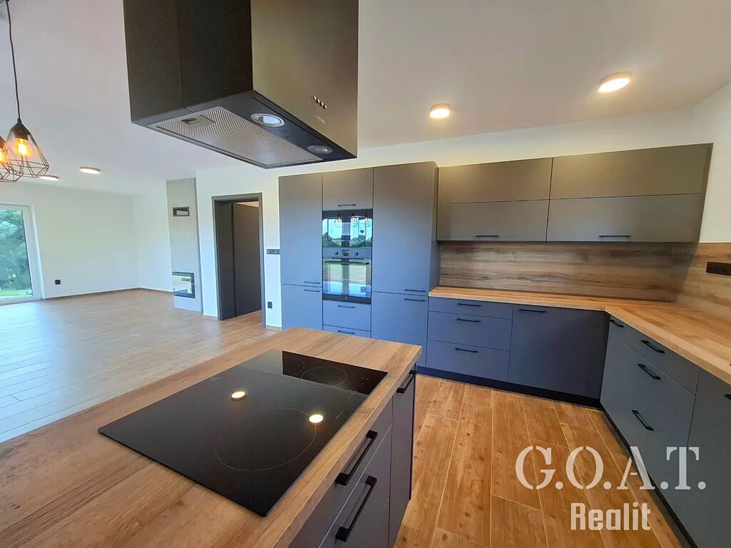 Dominantou prostorného obývacího pokoje s kuchyňským koutem je krb a designová kuchyňská linka s vestavěnými spotřebiči – lednicí, myčkou, troubou, indukční varnou deskou, mikrovlnnou troubou a digestoří. Z obývací části je plánován přímý vstup na terasu s pergolou, ideální pro posezení i relaxaci s krásným výhledem.