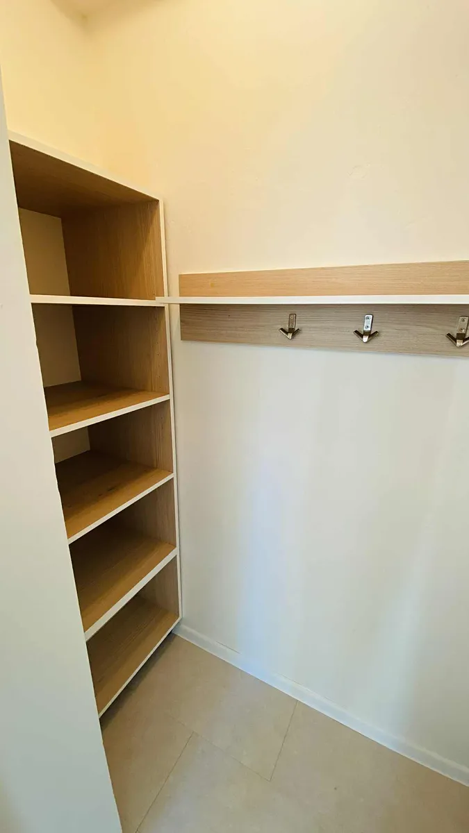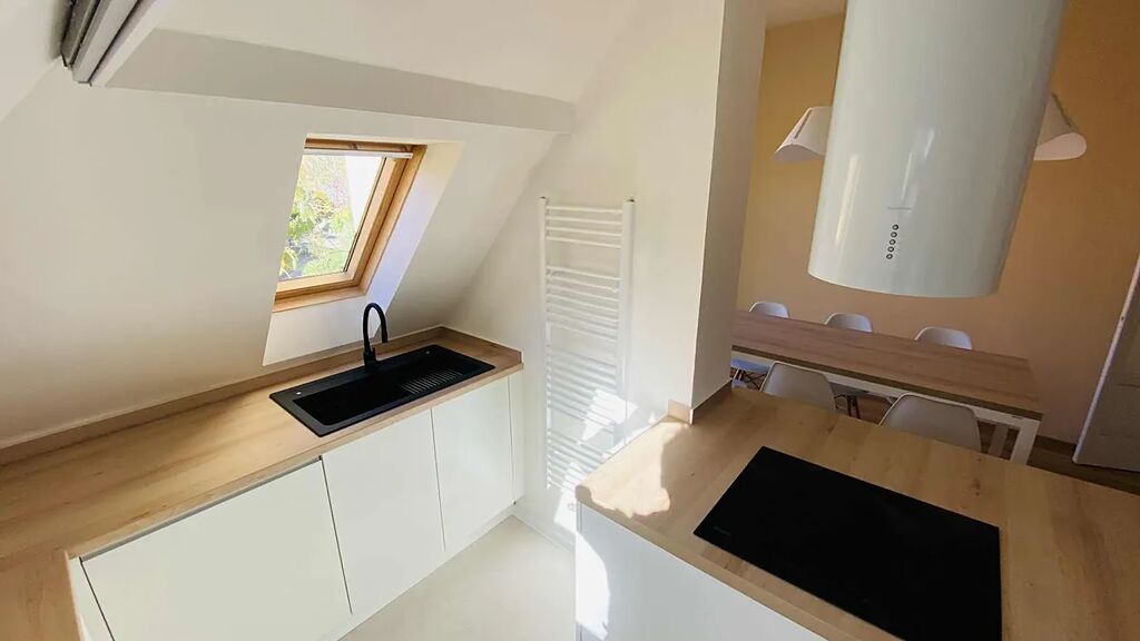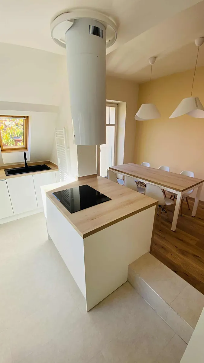 Byt je vybaven velkou komplet novou kuchyní - kuch.linkou na míru s mnoha úložnými prostorami, s ostrůvkovým vařením s vestavěnými spotřebiči Whirlpool (indukční varná deska, samostatná elektrická trouba, mikrovlnka, myčka na nádobí, velká lednice s mrazákem), ostrůvková stropní digestoř Klarstein, dřez s baterií Alveus.