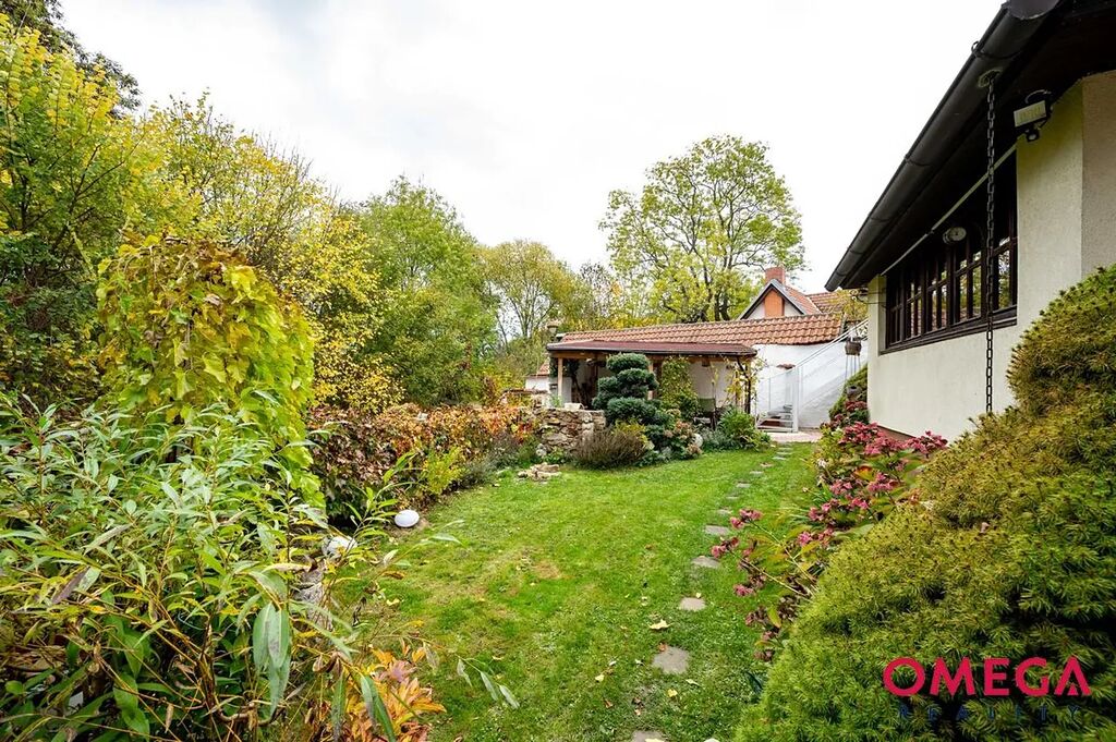 Před domem se nachází pergola, garáž u vstupu a sklep přístupný zvenčí (umístěný pod schody u pergoly). Ze sklepa pravděpodobně vede chodba směrem k farnosti, což dodává domu zajímavý historický rozměr.