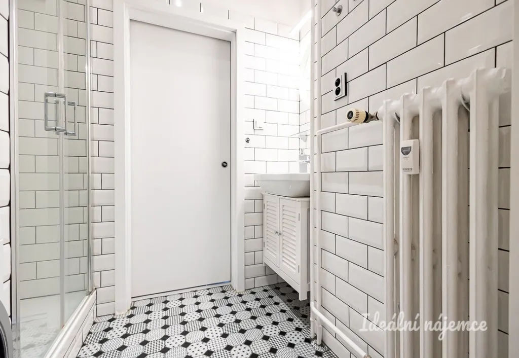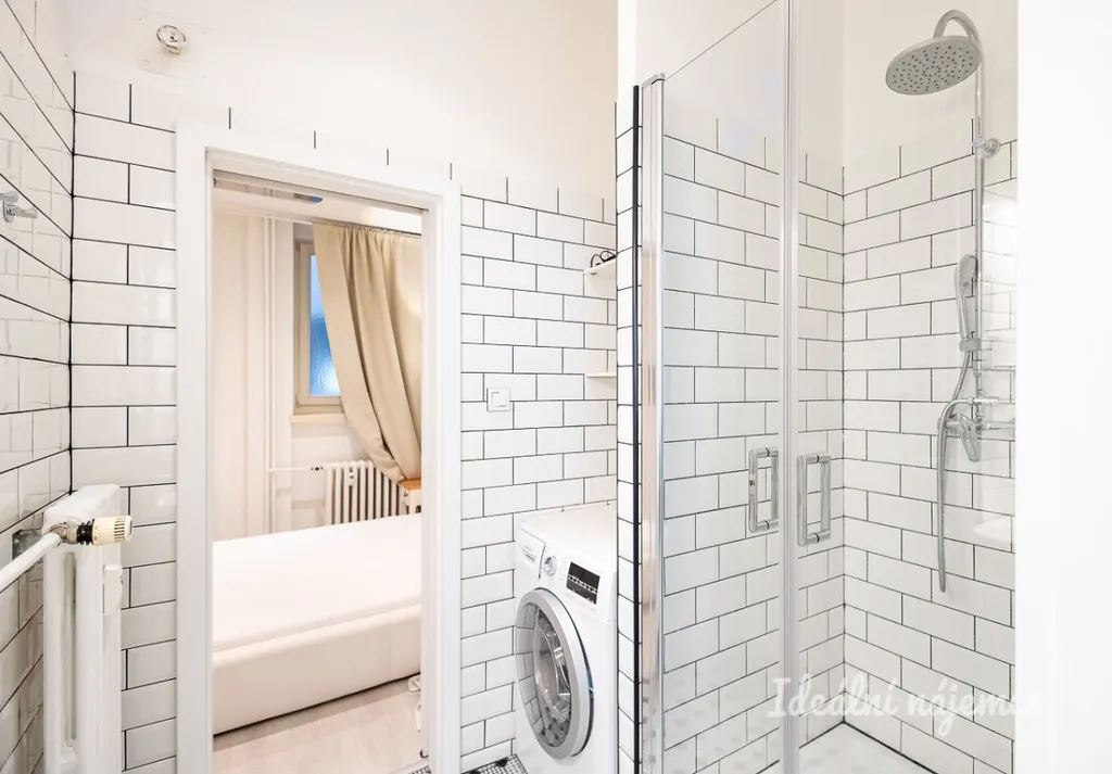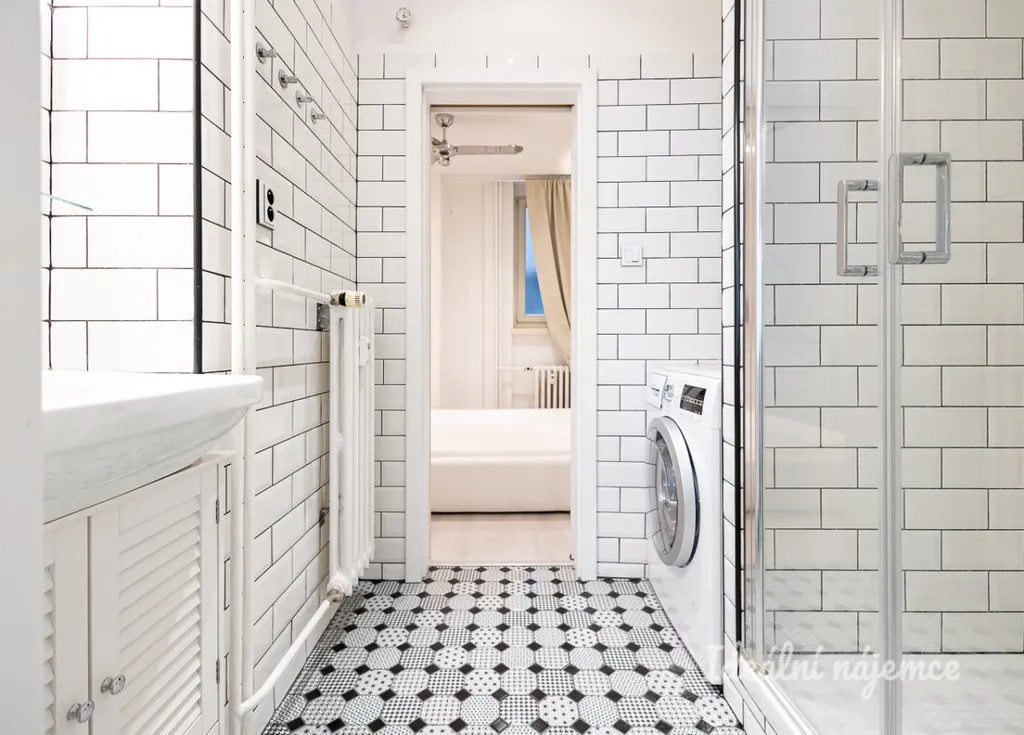 Z koupelny lze vejít jak do ložnice, tak i do obývacího pokoje. Je zařízena sprchovým koutem, pračkou a umyvadlem.