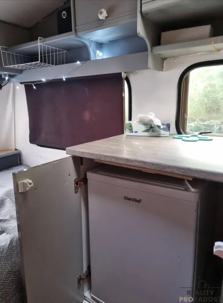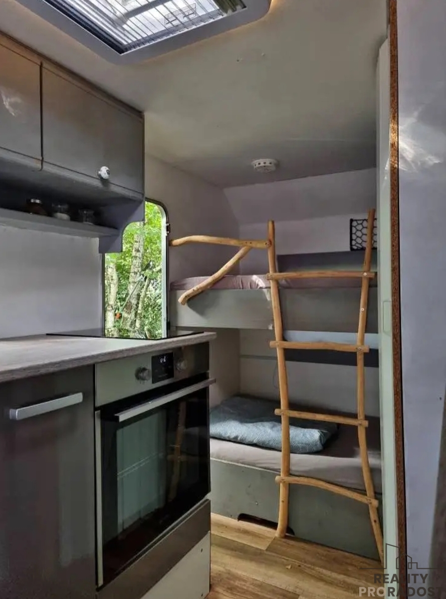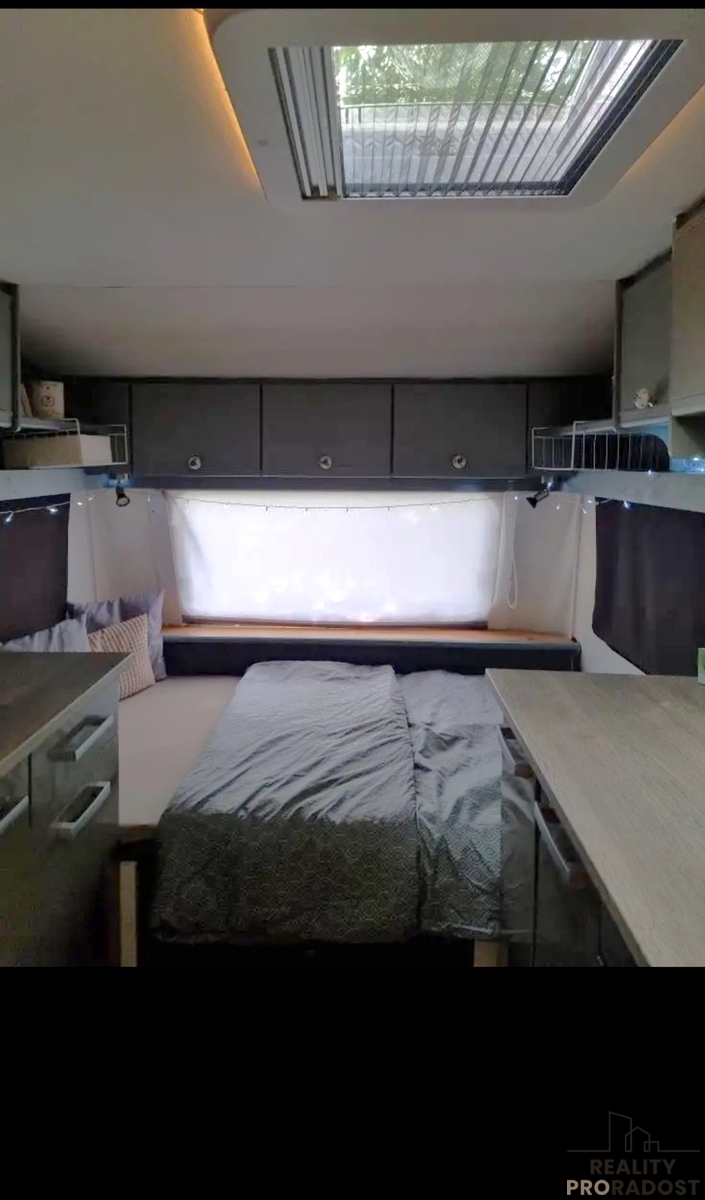Na pozemku se nachází karavan určený pro komfortní pobyt až čtyř osob. Karavan je vybaven velkým letištěm a palandou ( poschoďová postel ), které nabízí pohodlné spaní a stůl vhodný pro běžné stravování. V rámci vybavení je také chemické WC, elektrické rozvody 230 V, horkovzdušná trouba a indukční vařič pro snadné přípravy jídel.