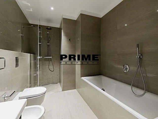 Moderní, exkluzivní, 3 ložnicový, klimatizovaný, nezařízený byt se 2 koupelnami k pronájmu, 4+kk, 178m2, se 2 terasami (16m2 a 13m2) a s možností garážového stání, situovaný ve 3. patře s výtahem v nově postaveném bytovém komplexu s recepcí, wellness klubem (vnitřní bazén, sauna, terasa s lehátky), společnou zahradou a podzemním parkingem.
