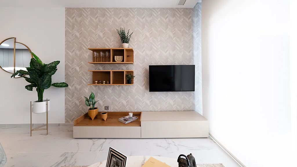 Interiér je navržen s důrazem na vzdušnost, pohodlí a propojení s okolím. Otevřený obývací prostor s kuchyní a jídelní částí tvoří přirozené centrum bytu, zatímco tři ložnice poskytují dostatek místa pro rodinu, hosty i práci. Každá koupelna má své vlastní řešení – hlavní ložnice disponuje en-suite koupelnou, další dvě jsou prakticky rozmístěny pro maximální komfort.