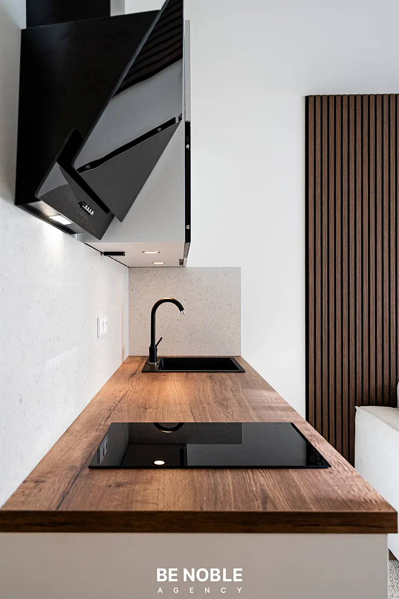Byt byl navržen tak, aby dokonale využil každý centimetr prostoru a zároveň působil útulně i elegantně. Součástí je moderní kuchyňská linka s dostatkem úložných prostor, varnou deskou, lednicí, mikrovlnnou troubou a vestavěnou digestoří. Obytná část je vybavena kompletním nábytkem, dekorem a osvětlením od společnosti Bonami v celkové hodnotě přes 350 000 Kč – tedy nejen kuchyní, ale i pohovkou, komodou, stolem, závěsy, záclonami a designovými svítidly. Výsledkem je byt, který je připraven k okamžitému užívání nebo pronájmu – bez nutnosti dalších investic. Velké okno orientované do klidného vnitrobloku zajišťuje dostatek světla a příjemný výhled z 5. patra. V koupelně se nachází sprchový kout, toaleta a úložné prostory pod umyvadlem.