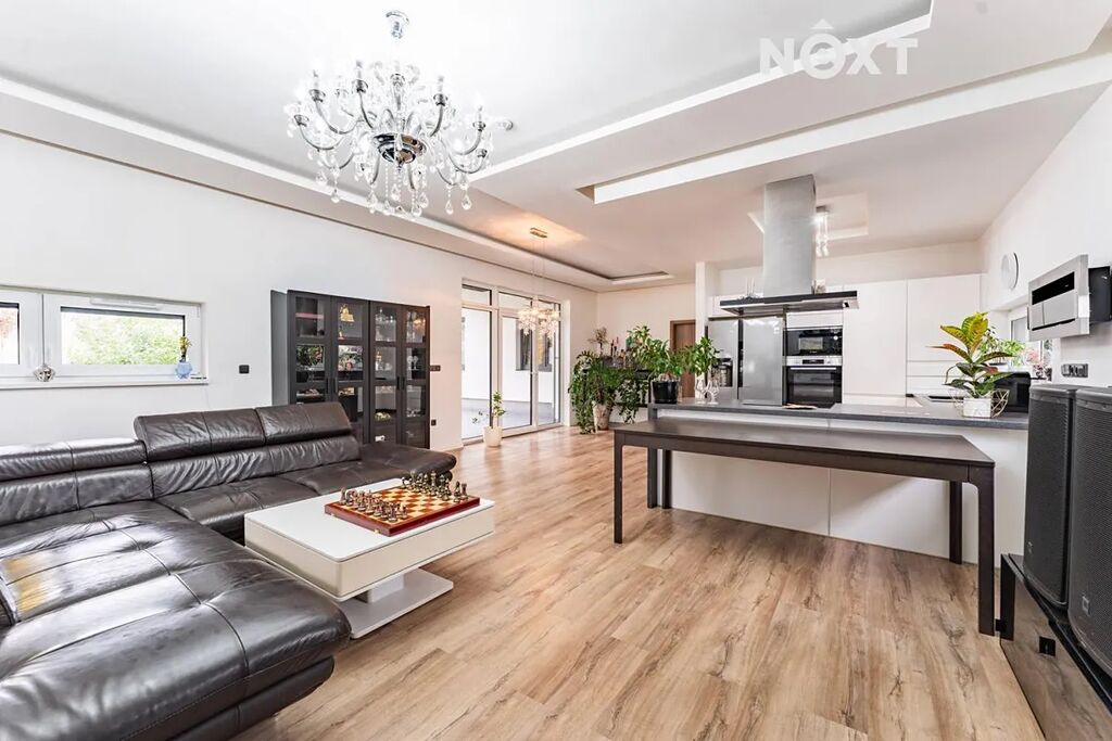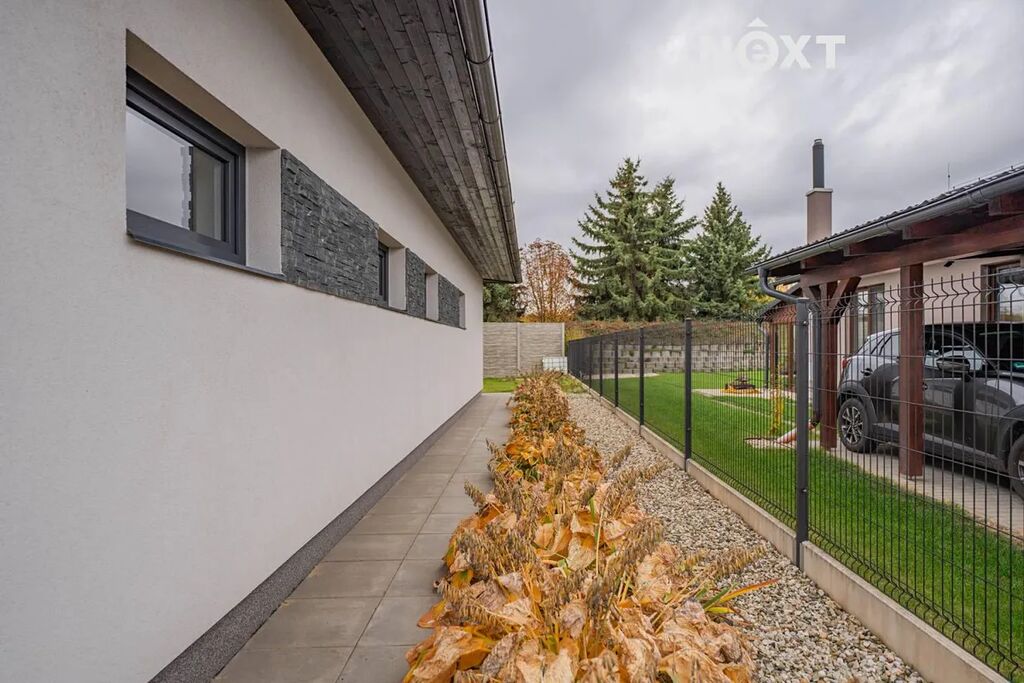 Dům nabízí dispoziční řešení 4+kk s prostorným obývacím pokojem, který díky netradičně vysokým stropům (3,2 m) působí mimořádně vzdušně a velkoryse. Na něj navazuje moderní kuchyně s jídelní částí, odkud je přímý vstup na terasu o velikosti 26 m² a zahradu s jihozápadní orientací. Kuchyňská linka je vyrobena na míru, vybavena vestavěnými spotřebiči a navržena tak, aby poskytovala maximum pracovního i úložného prostoru. Součástí domu je místnost pro šatnu, samostatná toaleta pro hosty, technická místnost s pračkou, sušičkou a bojlerem. Koupelna s vanou i sprchovým koutem a další toaletou, tři neprůchozí pokoje a garáž o ploše 25 m² s automatickými vraty.