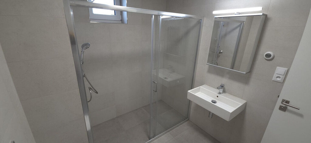 Koupelna je vybavena sprchovým koutem , toaletou, topným žebříkem a umyvadlem s koupelnovou skříňkou.