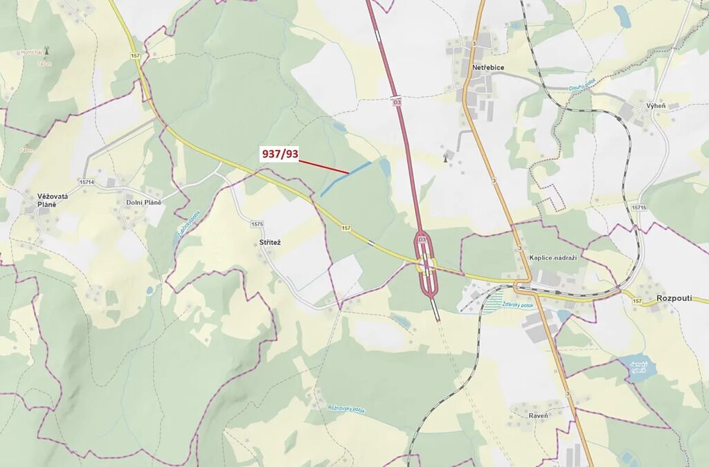 Lesní pozemek o výměře 8 502 m2, parcelní číslo 937/93, podíl 1/1, katastrální území Netřebice, obec Netřebice, obec s rozšířenou působností Kaplice, okres Český Krumlov, Jihočeský kraj. Po těžbě.