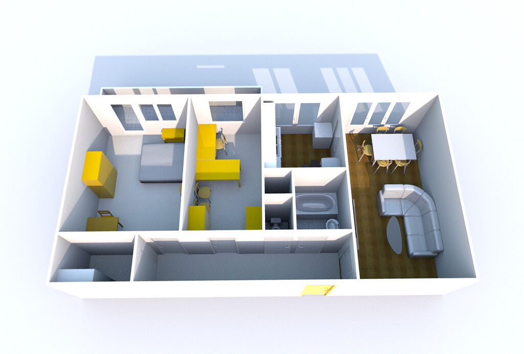 Dominantou bytu je obývací pokoj navazující na malou kuchyň. V rámci rekonstrukce byla kuchyň vybavena novou kuchyňskou linkou. Kuchyňská linka je vybavena zabudovanými spotřebiči. Koupelna je vybavena vanou.  WC je samostatné.  V chodbě se nachází prostorné šatní skříně a vstupy do dalších samostatných pokojů – ložnice a dětského pokoje a komory.  Na všech plastových oknech jsou žaluzie. Veškerá okna bytu jsou orientována na jihozápadní  stranu do zeleně, což zajišťuje dostatek klidu a soukromí.