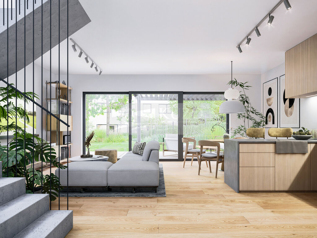 Užitná plocha domu činí přibližně 126 m² a rozložení prostoru je navrženo s ohledem na pohodlí celé rodiny. V přízemí se nachází prostorný obývací pokoj s velkými okny a přímým vstupem na terasu, na kterou plynule navazuje zahrada. Součástí obytné části je také kuchyňský kout, ideálně umístěný pro propojení s jídelnou i terasou, dále technická místnost, koupelna s WC a praktická pracovna. V horním patře jsou tři ložnice, šatna a hlavní koupelna.