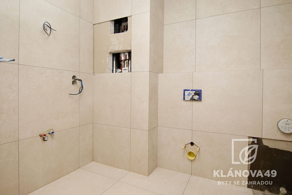 Tento konkrétní byt 4+kk má orientaci na severní stranu do zahrad, mimo silnici. Z výstavby je dokončena hrubá stavba, jsou instalována okna a pokračují práce na instalacích uvnitř domu.