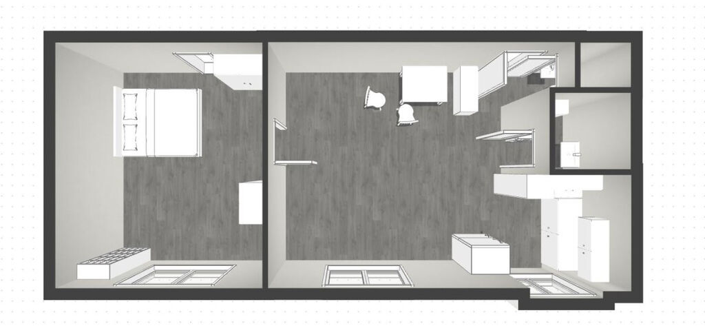 V hlavní místnosti nalezneme kuchyňský kout jehož součástí zůstane elektrická trouba, mikrovlnná trouba, varná deska a myčka. V pokoji je dostatečný prostor pro obývací pokoj a jídelní kout.  Oddělený pokoj zůstane vybaven manželskou postelí, skříní a psacím stolem.