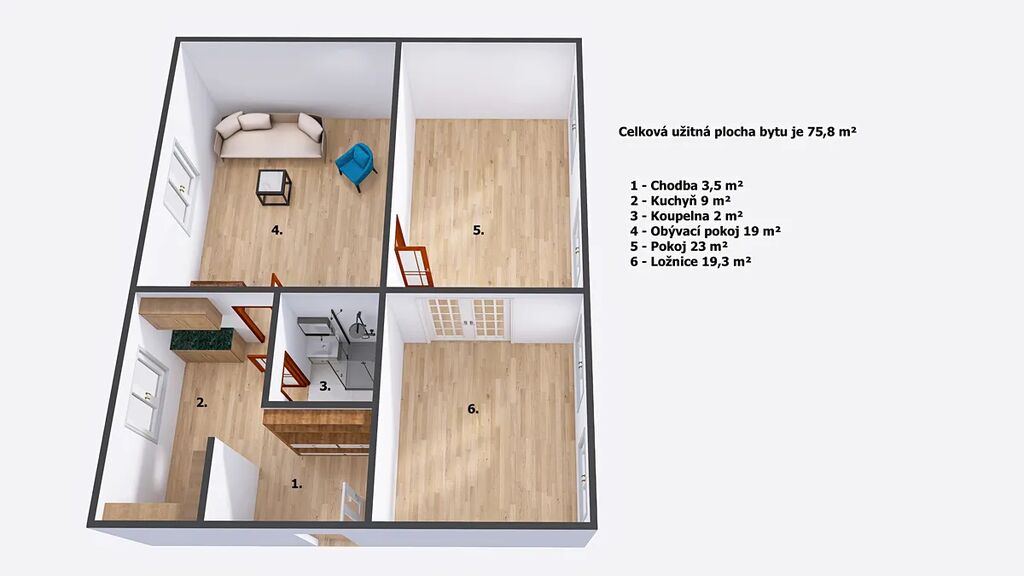 Byt o velikosti 75,8 m² se nachází v přízemí domu a potěší svou příjemnou atmosférou i praktičností. Každá místnost má dostatek světla a prostoru, aby si tu svůj kout našel každý člen rodiny.