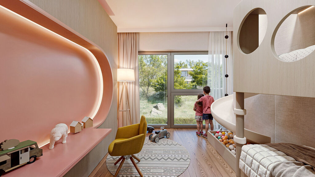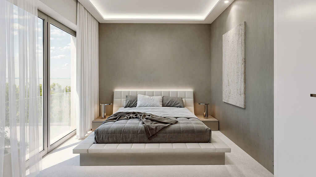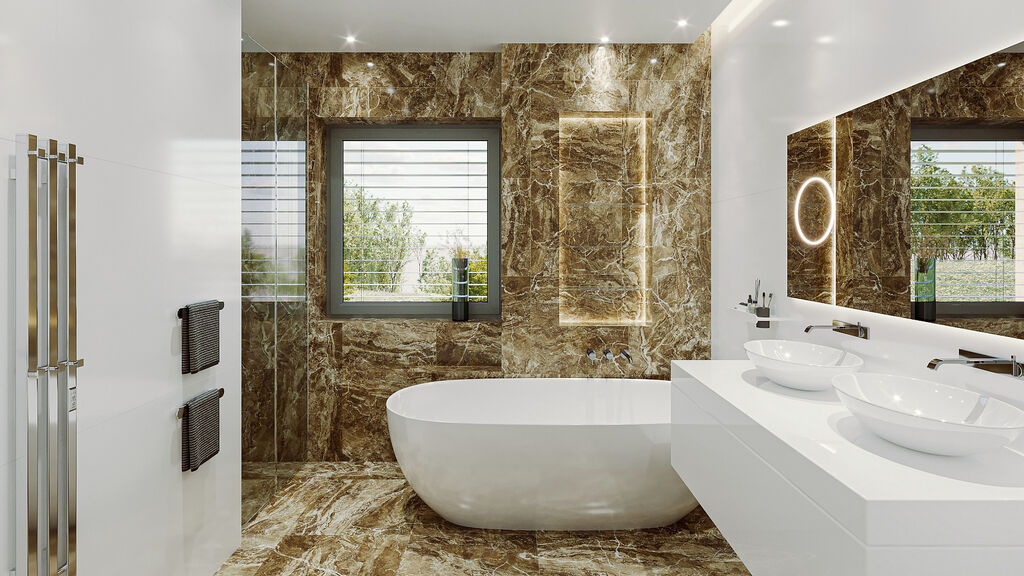 • Luxusně zařízená koupelna dle vizualizací (vana, sprchový kout, podomítkové baterie, dvojité umyvadlo, osvětlené zrcadlo, topný žebřík, nika)