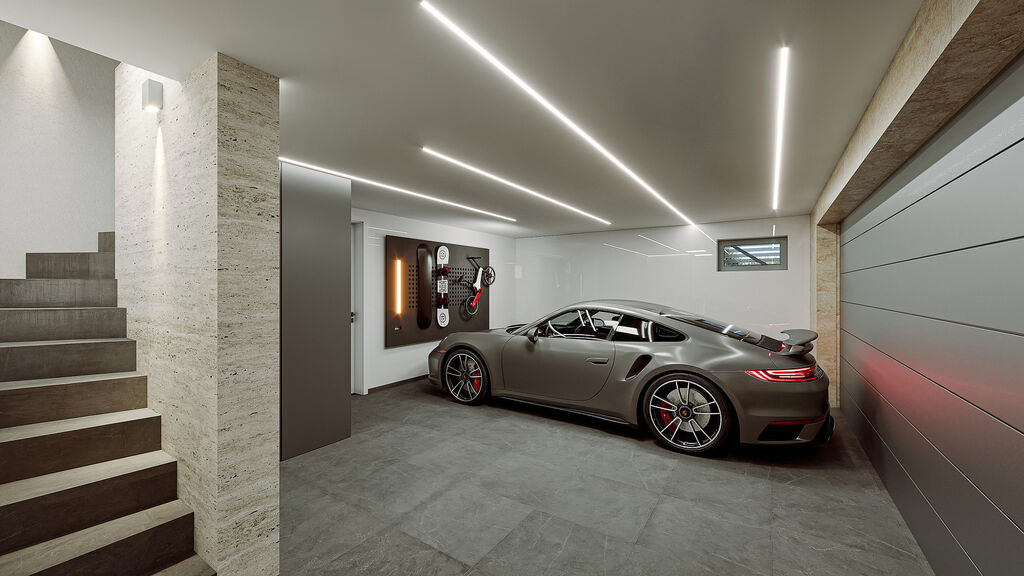 • Velkorysá garáž pro 2 vozy (35 m²) obložená italským travertinem