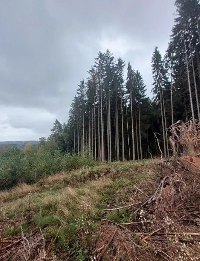 V dřevinné skladbě má nejvyšší zastoupení dřevina SM (38 %). Vysoké zastoupení BR (20 %) je dané jejím přirozením zmlazením na rozsáhlejších plochách po zpracování nahodilých těžeb a v proředěných částech starších porostů. Celková plocha holin činí 20 %, místy na plochách s nezpracovanou nahodilou těžbou. Zastoupení DB a BO je v samostatných porostních skupinách, DB je oplocený drátěnou oplocenkou. Celkové zakmenění je nízké 6,9 – porosty jsou místy rozvolněné, místy prolámané. Vysoký podíl na nízké hodnotě celkového zakmenění má i podíl holin. Mírně nadprůměrné bonity (RVB) mají hodnotu 1,52.