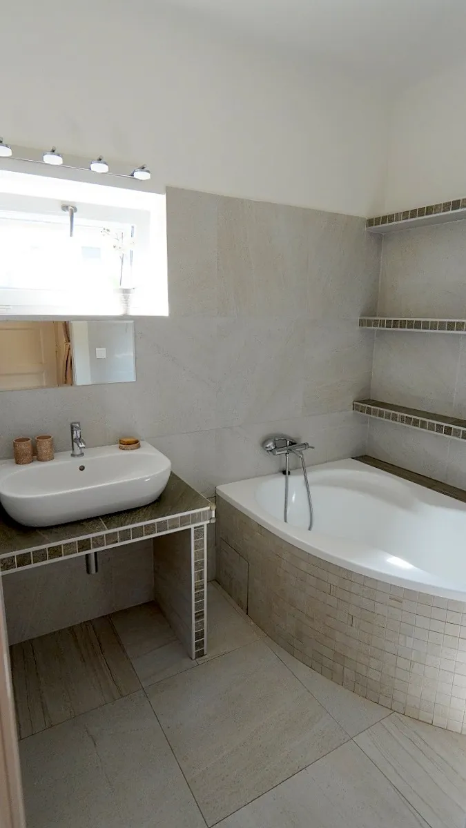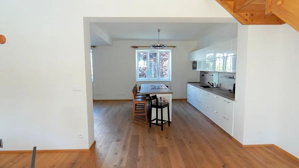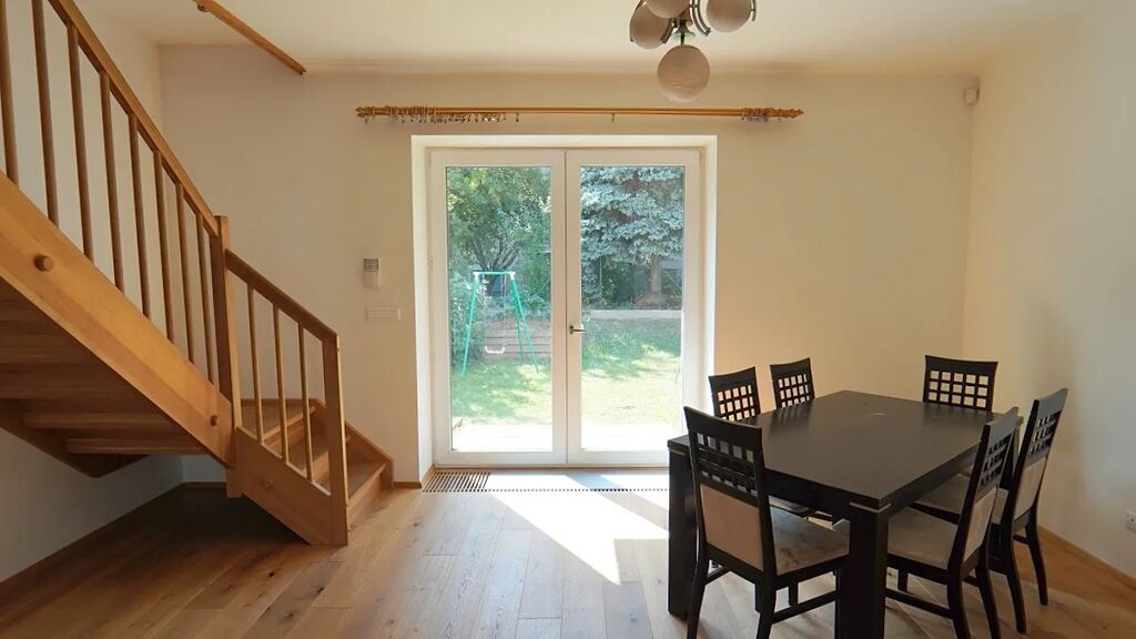 K užívání je dále zahrada o ploše cca 300 m2, prádelna a dva sklepy v suterénu (34,7 m2). K dispozici je garáž a 2 parkovací stání na pozemku. Přístup do dvoupodlažního bytu je jak z přízemí, tak z patra hlavního domovního schodiště. Je tedy možné byt užívat současně i například jako kancelář a byt. V pokojích i na chodbách je dřevěná podlaha, byt i dům má elektronické zabezpečení. V podkroví je pronajatá jedna bytová jednotka s vlastním vnitřním domovním schodištěm. Dům leží na velmi klidném místě, v oblíbené rezidenční části pražské čtvrti Spořilov se spoustou zeleně, a přitom ideální dostupností do centra Prahy.  V docházkové vzdálenosti je stanice MHD – Nad Pahorkem (autobusy č. 170, 135, 136, 213). V okolí je veškerá občanská infrastruktura (Penny, Albert, škola, školka, gymnázium apod.). Budoucí nájemce neplatí provizi. Výše vratné kauce 120 000 Kč. K nastěhování ihned.