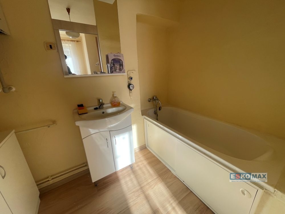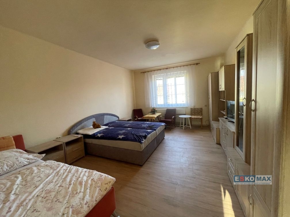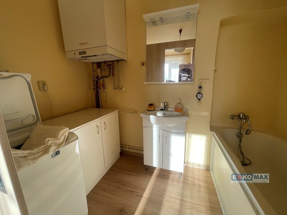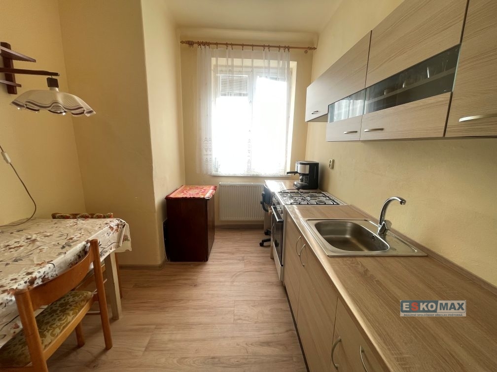 Dispozice – kuchyně, pokoj, chodba, šatna, koupelna, samostatné WC s oknem, balkon. Příslušenstvím bytu je sklep. Byt je po rekonstrukci, pronajímá se včetně zařízení, které je na fotkách (nová vestavěná skříň na chodbě, pračka, postele, obývací stěna, televize a pod.). Za domem je společný dvorek, který lze také využívat. Bytový dům je po částečné revitalizaci – vnější omítky, rozvody IS ve stoupačkách, vchodové dveře.  Ideální bydlení pro 1 – 2 osoby bez zvířat. Nájemné je  celkem 15.000,-Kč/měsíc včetně zálohy na energie ve výši cca 3.000,-Kč/měsíc. Vytápění je plynovým kotlem v koupelně.
