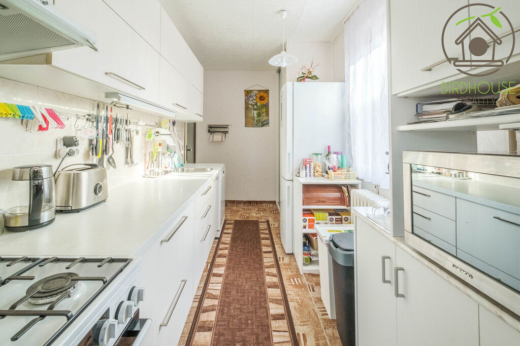 Obývací pokoj (21,1 m²) poskytuje dostatek prostoru pro sezení i jídelní kout a nabízí přímý vstup na prostornou lodžii (6,9 m²), která je ideální pro odpočinek. Kuchyně (8,54 m²) je vybavena kuchyňskou linkou ve velmi dobrém stavu. Dva samostatné pokoje (12,2 m² a 13,5 m²) lze využít jako ložnici a dětský pokoj, případně pracovnu. Všechny pokoje jsou vybavené praktickými předokenními roletami, které zajišťují soukromí.