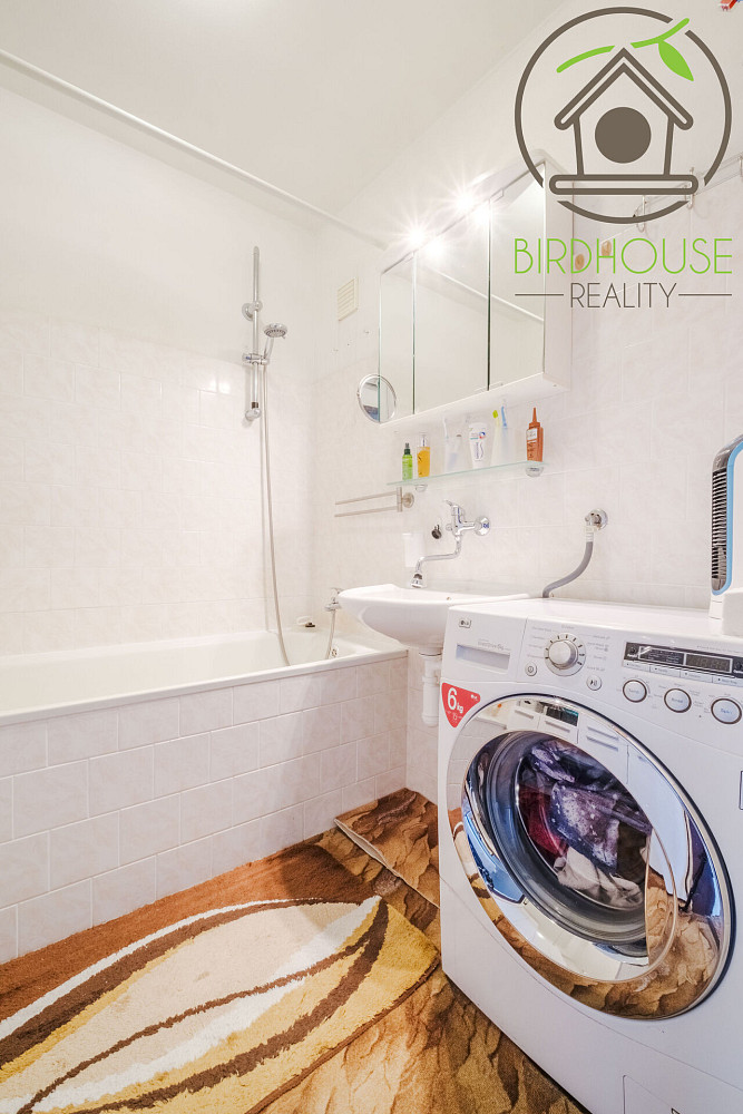 Koupelna (3,45 m²) s vanou a samostatná toaleta (1,41 m²) poskytují komfortní zázemí. Byt dále nabízí prostornou chodbu (10,3 m²) a předsíň s komorou (6,8 m²), kterou lze upravit například na šatnu. K bytu náleží sklepní kóje v suterénu domu.