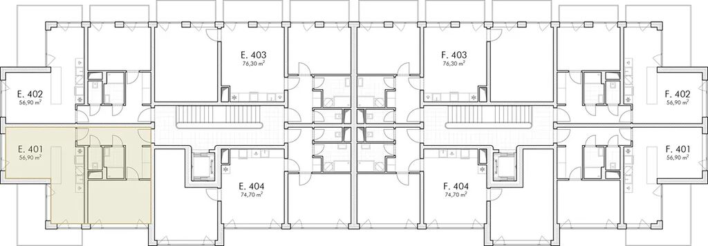 Koupelna je vybavena umyvadlem a prodlouženým sprchovým koutem, WC je samostatné. Hlavním obytným prostorem bytu je obývací pokoj s technickými přípravami pro napojení kuchyňské linky a dostatkem místa pro stolování, s velkými balkonovými dveřmi otevírajícími se na rohový balkón. Byt dále disponuje samostatnou ložnicí o velikosti více než 13 m2. Okna jsou orientována na západ a severozápad.