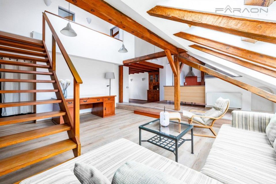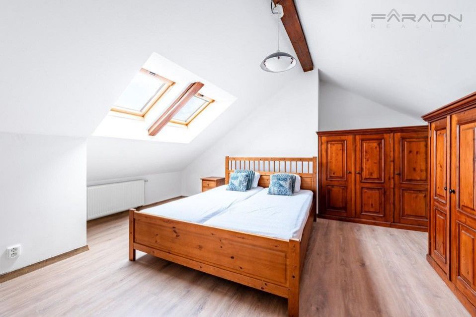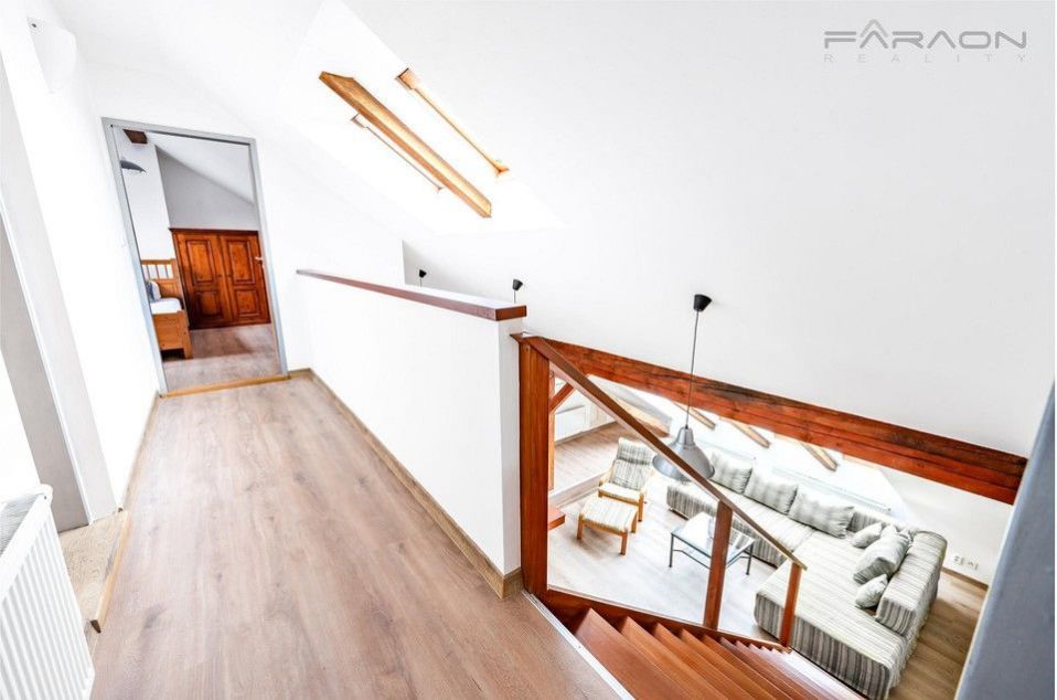 Byt se pronajímá zařízený, viz. foto. Kuchyně je vybavena nádobím a všemi spotřebiči - myčka, sklokeramická deska, trouba, digestoř, lednice. V ložnici je manželská postel, druhý pokoj může sloužit jako ložnice, šatna či pracovna. V bytě je dostatek úložných prostor. Nábytek vyrobený na zakázku, z masivu exotického dřeva, vhodně dotváří atmosféru přiznaných tesaných trámů v interiéru, s dřevěným schodištěm.