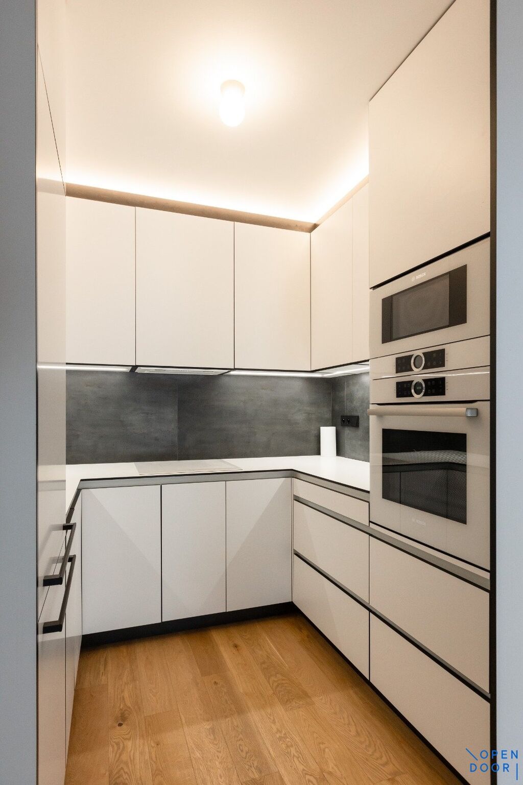 Velice vzdušný a světlý byt se nachází v 1. patře domu a je vybavený ve vysokém standardu. Ve spodním patře bytu je situovaný prostorný obývací pokoj s kuchyňským koutem. Ten je zařízený nadstandardní kuchyňskou linkou vybavenou veškerými spotřebiči - indukční varná deska, vestavná trouba a mikrovlnná trouba, myčka a lednička s mrazákem. Samotný obývací pokoj působí i díky zachovanému trámoví velice útulně, přičemž okna jsou směřována do tichého vnitrobloku.