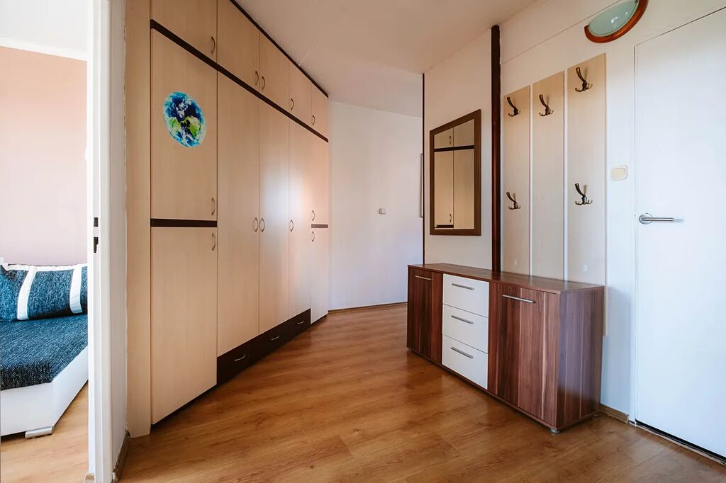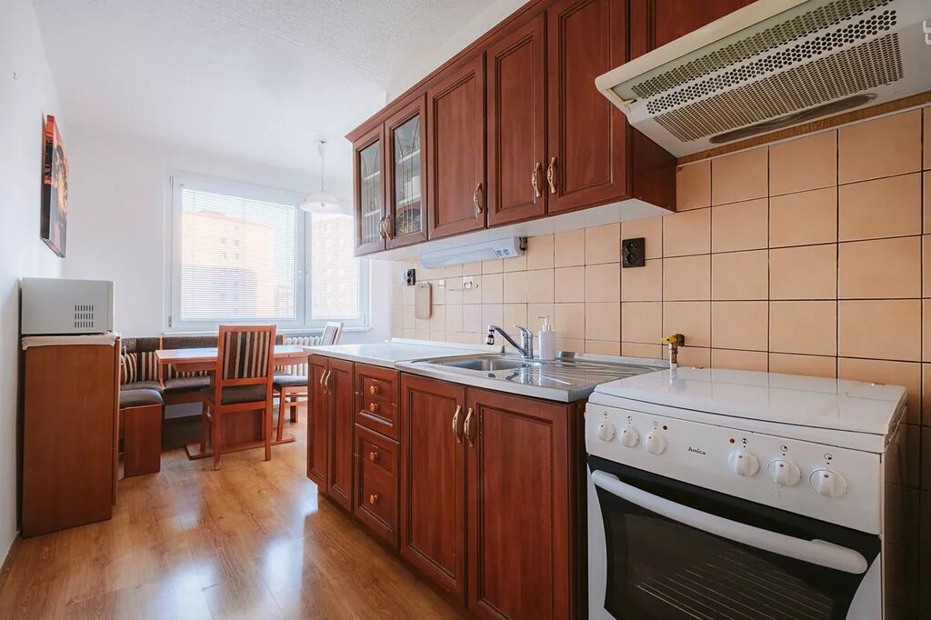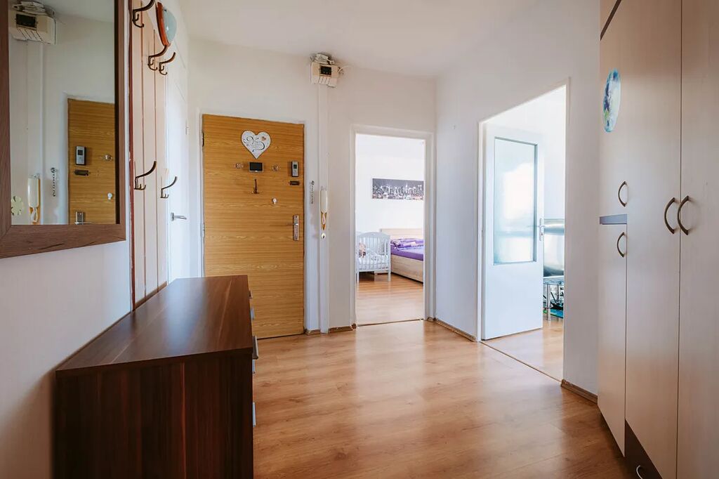 Byt disponuje velmi prostornou vstupní chodbou s vestavěnou skříní, samostatným WC, koupelnou s vanou, kuchyní s kuchyňským koutem a obývacím pokojem. Byt má plastová okna (dvojskla), plovoucí podlahy, jádro původní. Byt má také balkón (4 m2) s nádherným výhledem do přírody. K bytu náleží dvě sklepní kóje. Celý dům prošel revitalizací, je zateplený a v roce 2026 je plánovaná realizace výtahu. Vytápění bytu je dálkové ústřední, stejně jako ohřev vody (TTS). Celkové měsíční náklady na bydlení jsou 4 500 Kč (voda, ohřev vody, el., plyn, fond oprav, úklid společných prostor, internet).