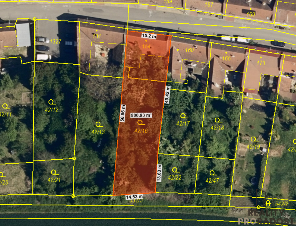 V zastoupení majitele Vám nabízíme stavební pozemek o výměře 801m2 ve slepé ulici obce Uhřice.  Uliční šíře je 15m a délka pozemku 56m. Na pozemku se nachází současná stavba rodinného domu v havarijním stavu určena k demolici. Zastavěná plocha stávajícího domu je 137m2. Dispozici tvoří průjezd, chodba, kuchyně, koupelna s WC a 3 pokoje. Za domem se nachází dvůr, přístřešek a studna. Dále navazuje zahrada do svahu.