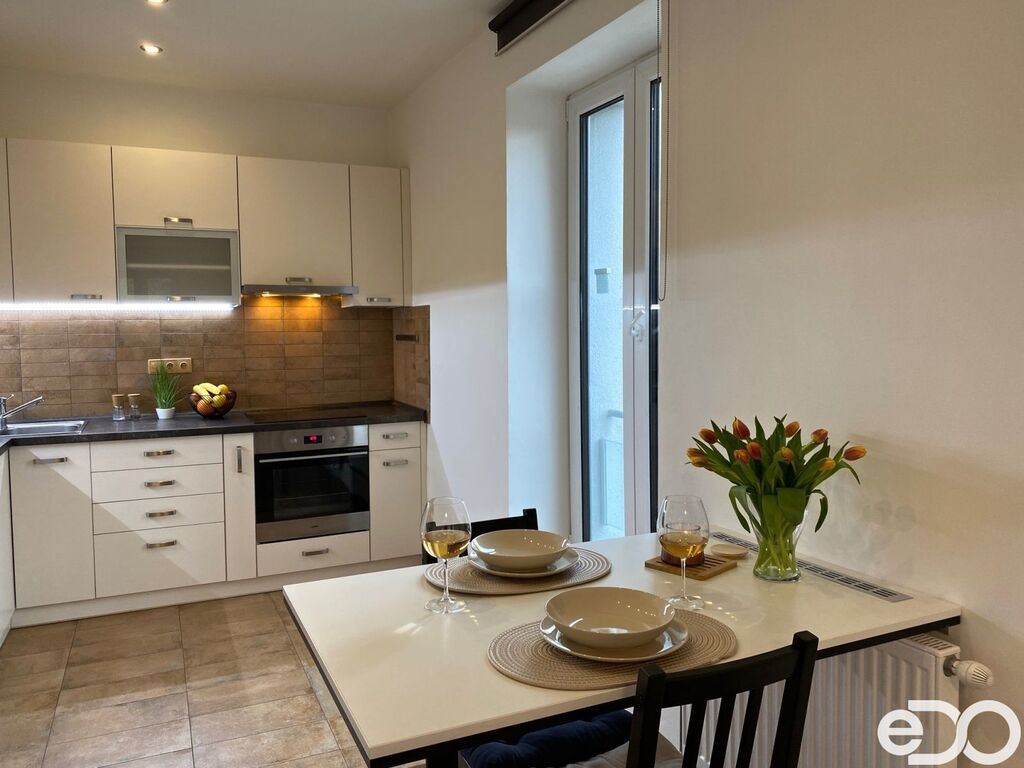 Byt je ve velmi dobrém stavu, disponuje podlahovou plochou 46m² a je částečně zařízen (kuchyňská linka včetně spotřebičů, stůl, židle, vestavěná skříň v ložnici, botník a věšák v chodbě). K bytu jsou také k dispozici dvě uzamykatelné venkovní kóje, společné pro všechny byty a část zrekonstruovaného podzemního sklepa. Vyhrazené parkovací stání se nachází na dvoře domu za bránou na dálkové ovládání. Na dvoře je také k dispozici elektřina a voda pro pohodlnější údržbu auta, motorky nebo cyklistických kol.