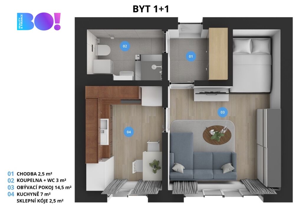 Dispozice je promyšlená do posledního detailu: světlý obývací pokoj pro večery v pohodlí, samostatná kuchyň na ranní kávu i domácí vaření, koupelna se sprchovým koutem a WC.