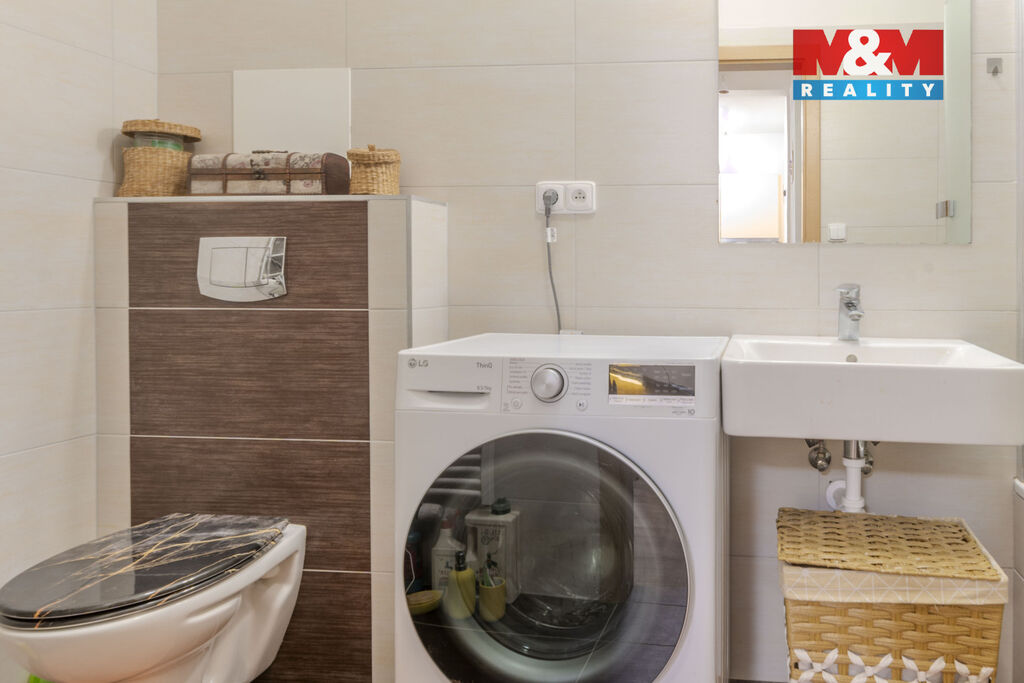 Dispozice zahrnuje obývací pokoj s kuchyňským koutem, ložnici, koupelnu, WC, chodbu a sklep.