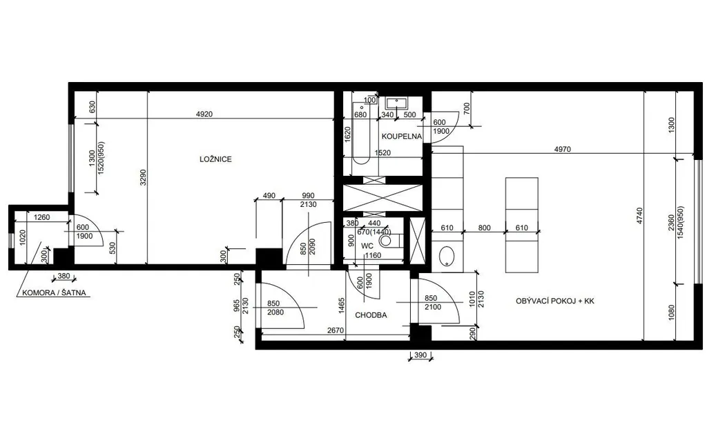 Ze vstupní chodby se samostatně vchází do: ložnice s šatnou (komorou), WC, obývacího pokoje s kuchyňským koutem, ze kterého vcházíte do koupelny.