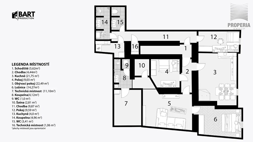 • Sanitární zařízení: Každý apartmán je vybaven kuchyní, vlastním WC a koupelnou.