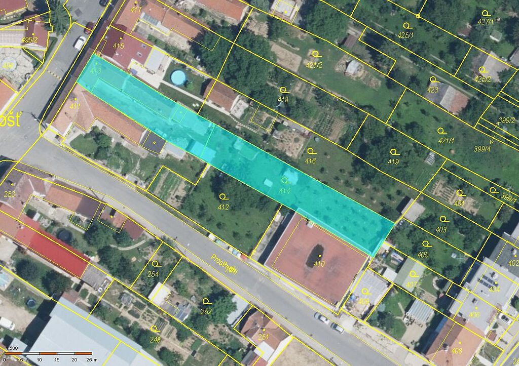 Budova se nachází na pozemku se zahradou, o celkové výměře 1059 m², z toho stavební parcela 426 m² + zahrada 633 m².