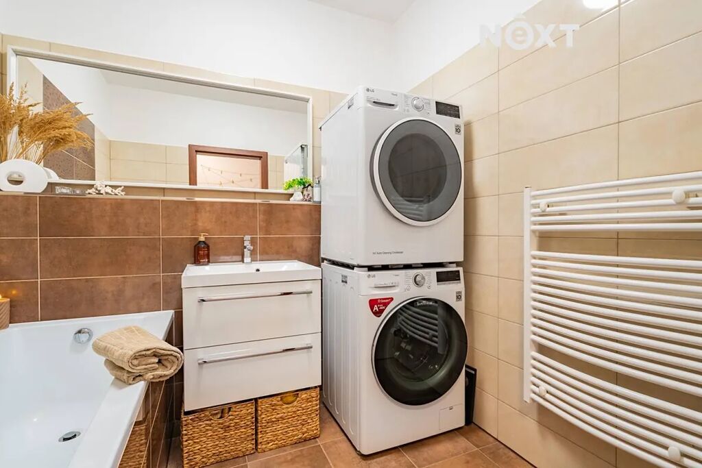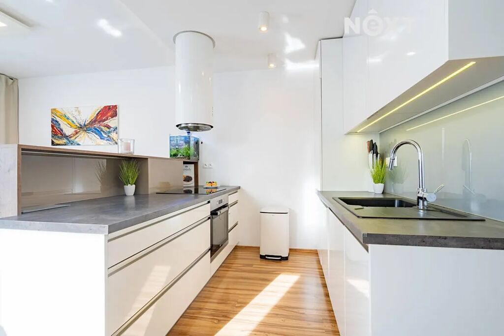 Interiér bytu zaujme promyšleným dispozičním řešením, kvalitním zpracováním a vyšším standardem vybavení. Kuchyňská linka byla vyrobena na míru a je vybavena vestavnými spotřebiči – myčkou nádobí, lednicí, indukční varnou deskou, mikrovlnnou troubou a elektrickou troubou. Součástí kuchyně je také podsvícený barový pult a snížený podhled se zabudovaným osvětlením, který prostoru dodává příjemnou atmosféru i moderní vzhled.